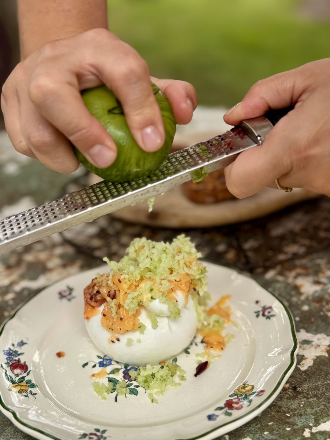 • À l’aide d’une râpe fine (type Microplane), râper la tomate verte, la pêche et les olives encore congelées directement sur la burrata.