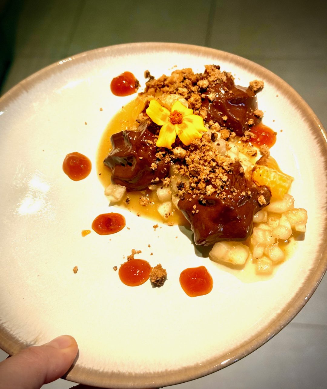 Disposer le coulis de poire, la brunoise de poire, faire des points de confiture d’églantine à l’aide d’une poche à douille, disposer la mousse au chocolat, terminer par les quartiers de mandarine et les cookies émiettés.