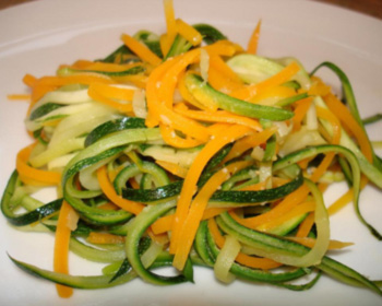 1 • Éplucher les carottes, courgettes et oignons. A l’aide d’un économe réaliser des tagliatelles avec les courgettes et la carottes.
